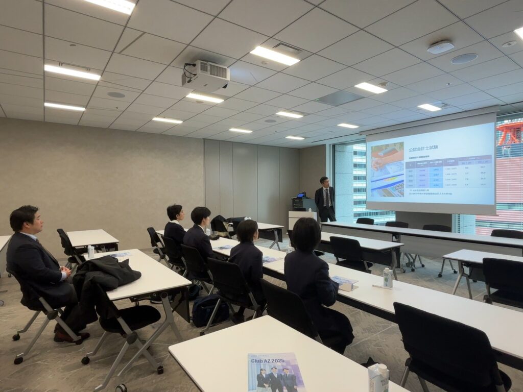中杉卒業生(36期)の村上さんが出迎えてくださり、まずは皆で村上さんのお話を聴きました。現在、あずさ監査法人で管理職を務めていらっしゃるそう。会計士の仕事内容や魅力について初めて知ることが多く、いっそう憧れが強くなりました・・・!