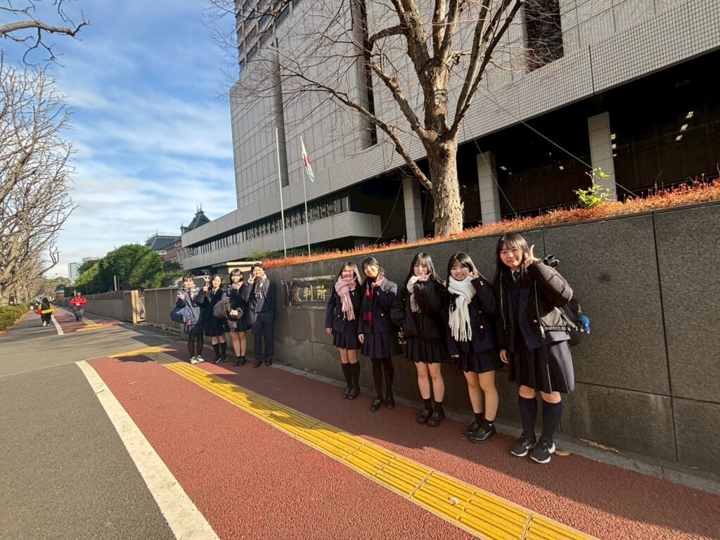 今回の傍聴は夏の日弁連の大会(高校生模擬裁判選手権 関東大会)で審査員だった裁判官の方に、メンバーが終了後お声掛けしたことがきっかけで実現したものです。講評を頂戴した後、(判事ご自身が手掛ける裁判を)いつか見においで!と言っていただけ、冬休みのこの日に傍聴となりました。
