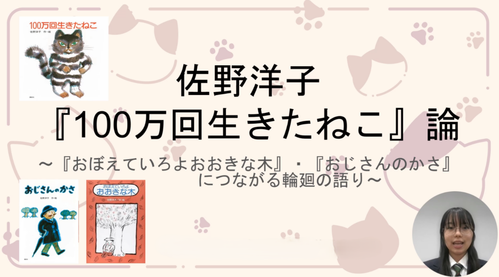 Sさんは佐野洋子の絵本の語りの特徴を分析し、作品世界が一冊だけで完結せず互いに関わりあって広がっているのだという読みを展開しました。