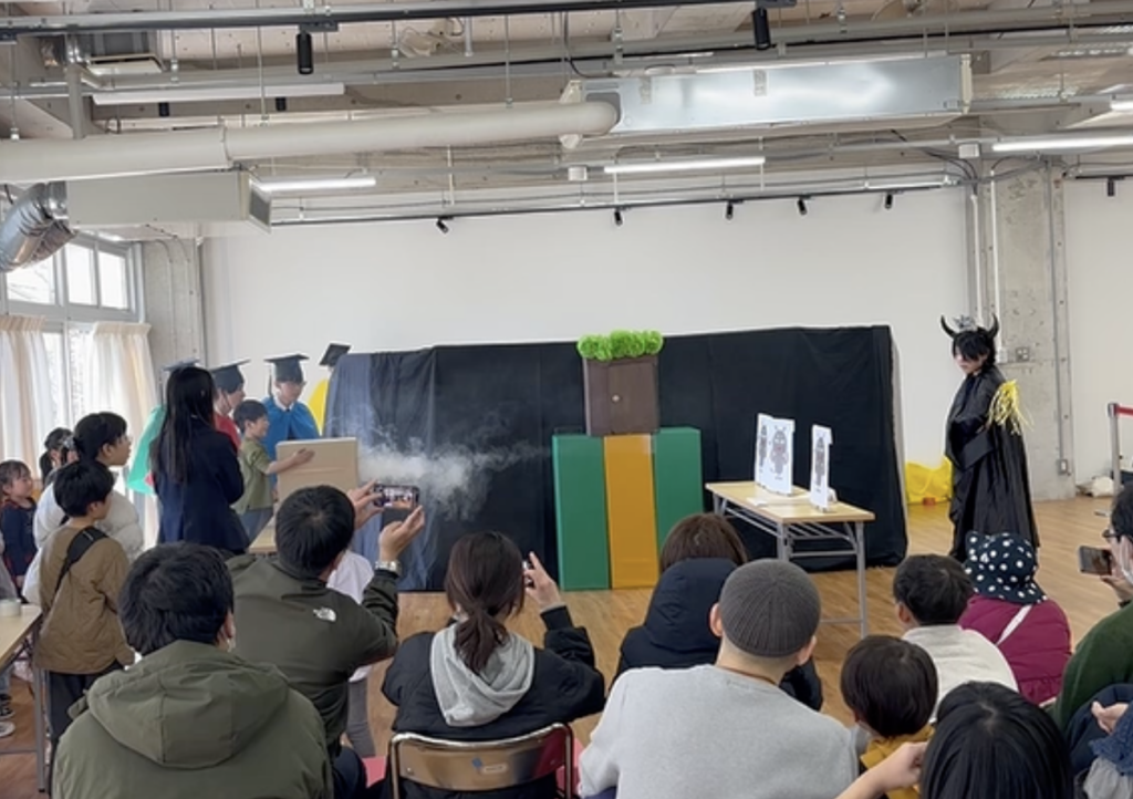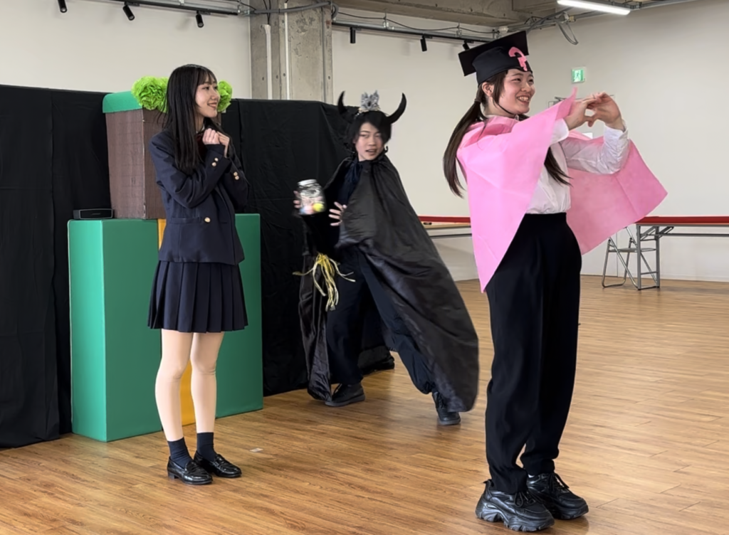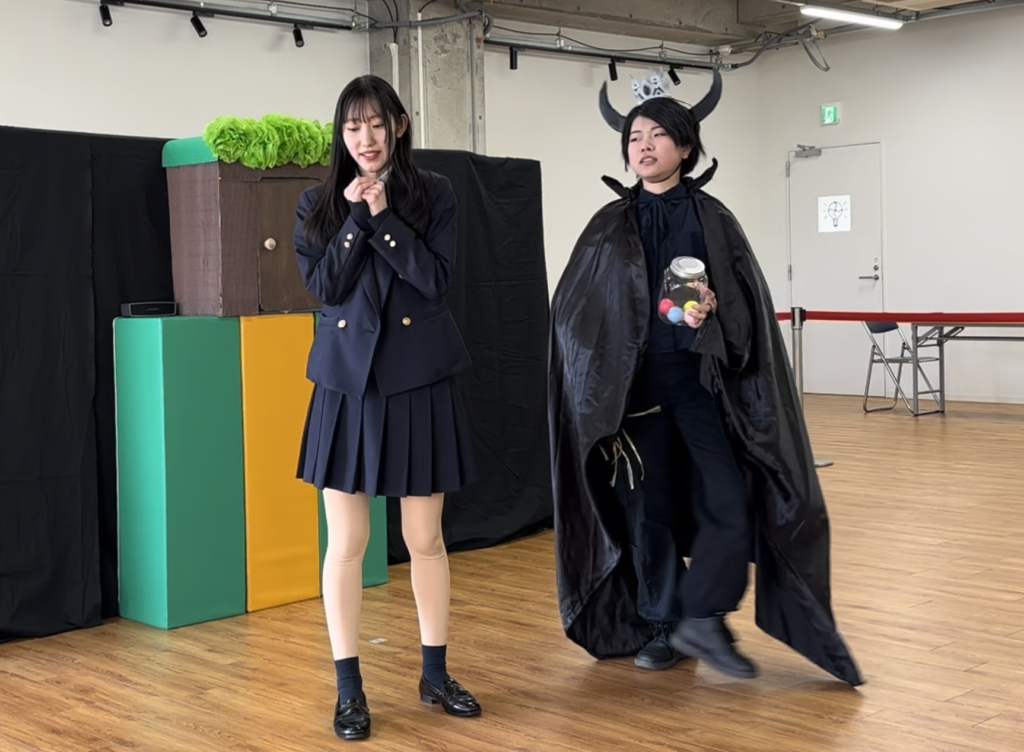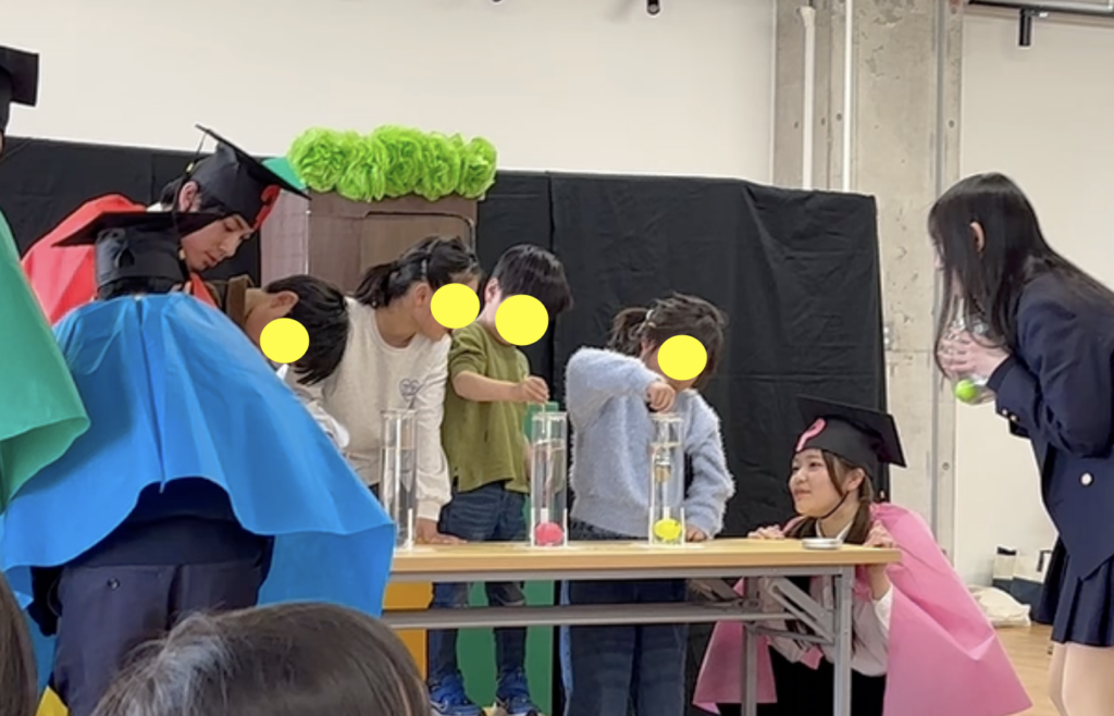 悪魔に奪われたボールを取り返す!というストーリーの中に、「空気砲」と「水流で浮き上がるボール」の実験を織り込み、子どもたちにも舞台に上がって一緒に実験をしてもらう!という体験型サイエンスショー。3公演やったのですが、1回目は緊張していた生徒たちも、2回目以降は子どもとやりとりする余裕が出てきて、その場で必要な台詞を補ったり、積極的に子どもと関わりあってお話を進めていけるようになっていました!
