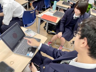 こちらは地図サイトを利用して、中杉の5km圏内がどの範囲になるか調べている様子です。自宅から5km圏内も調べ、合わせてハザードマップを参考にして避難時の危険を学びました。